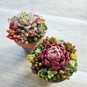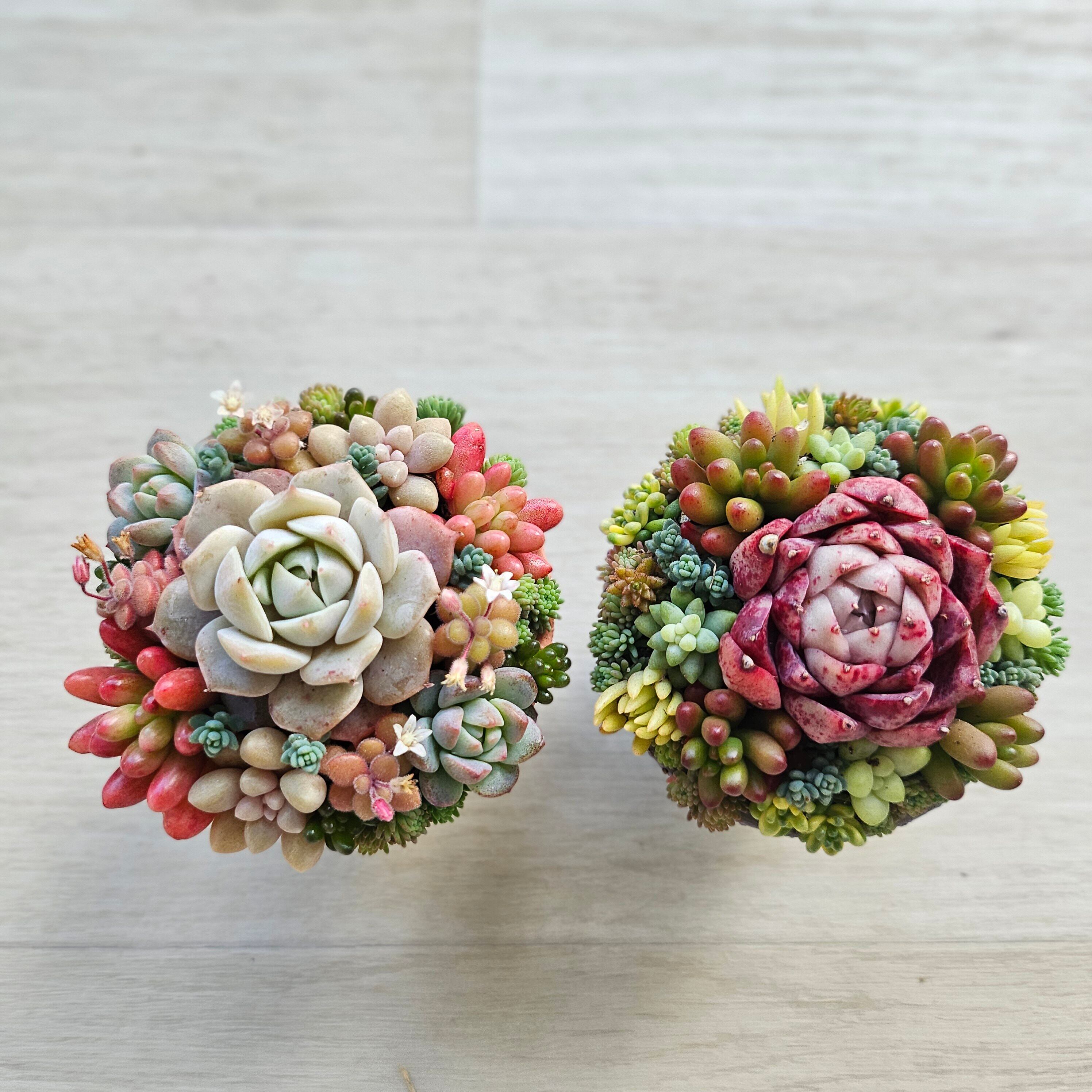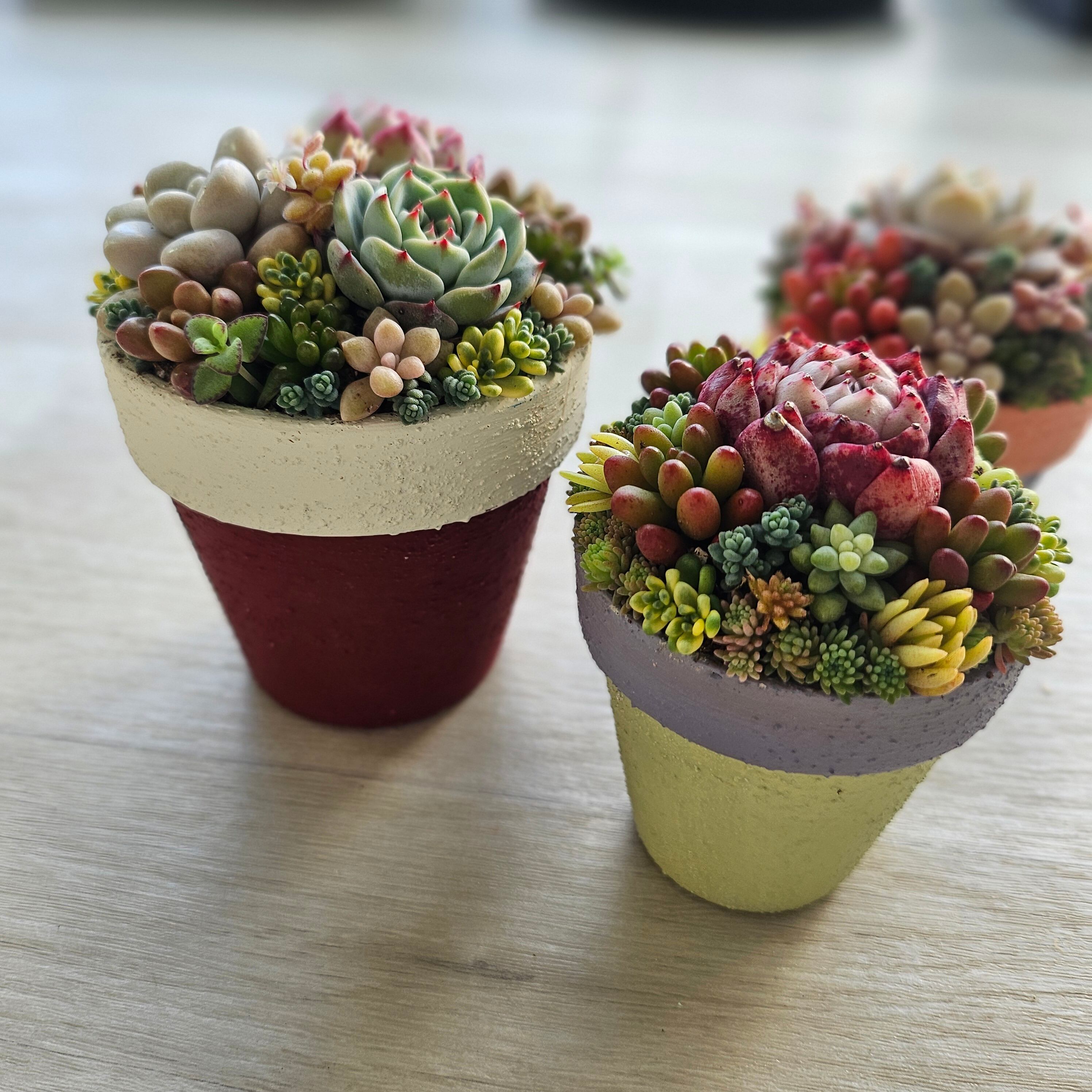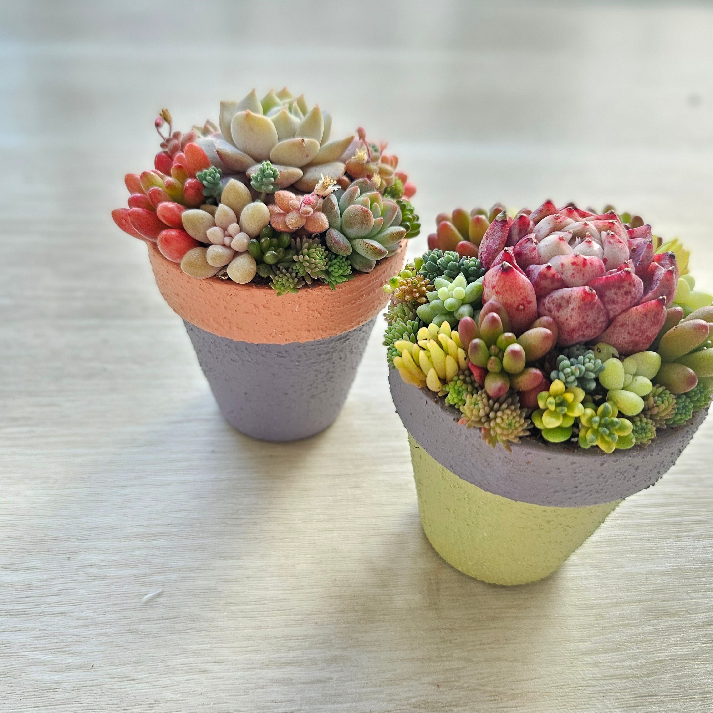 色とりどりの多肉植物をオリジナルリメイク鉢に丁寧に寄せ植えしました。