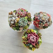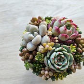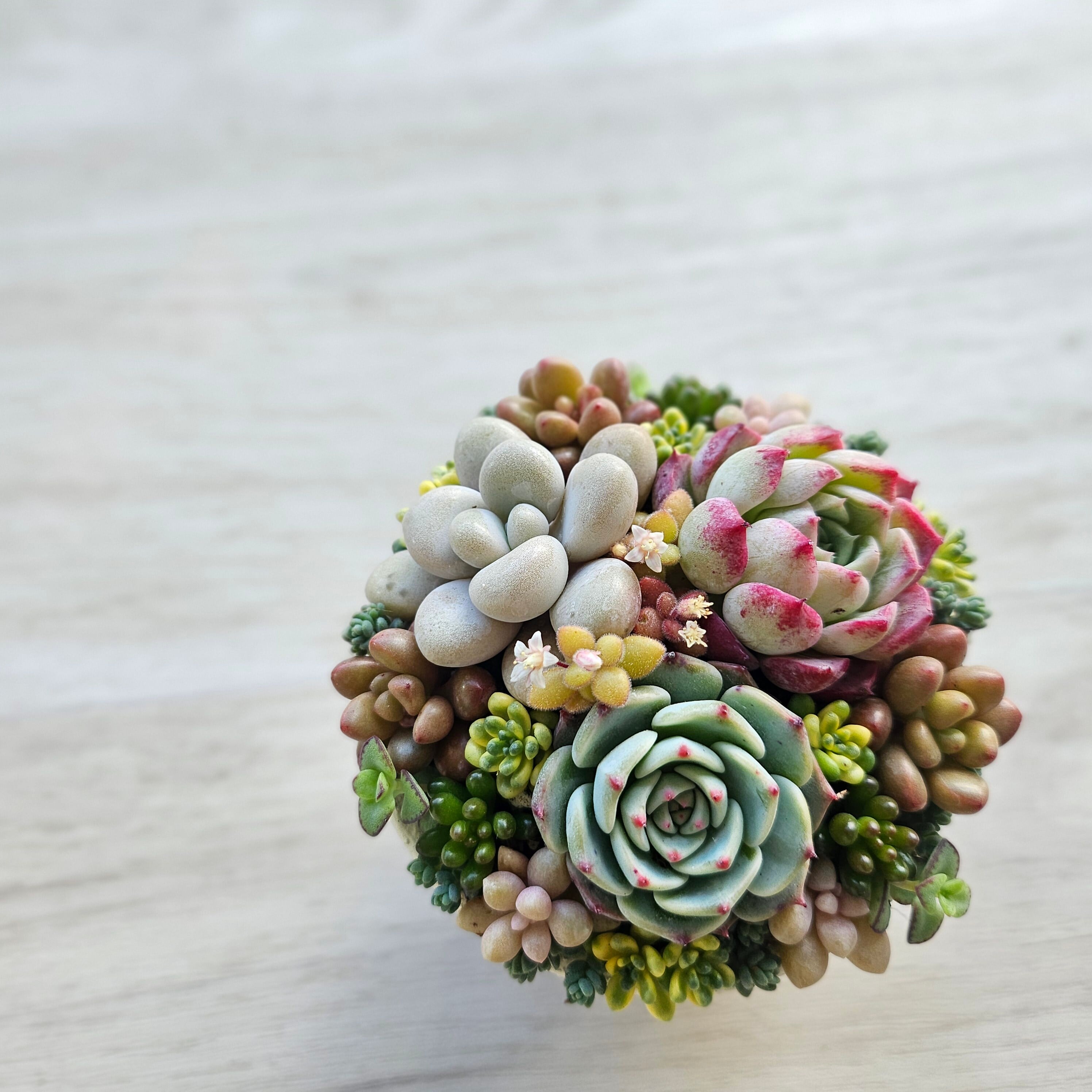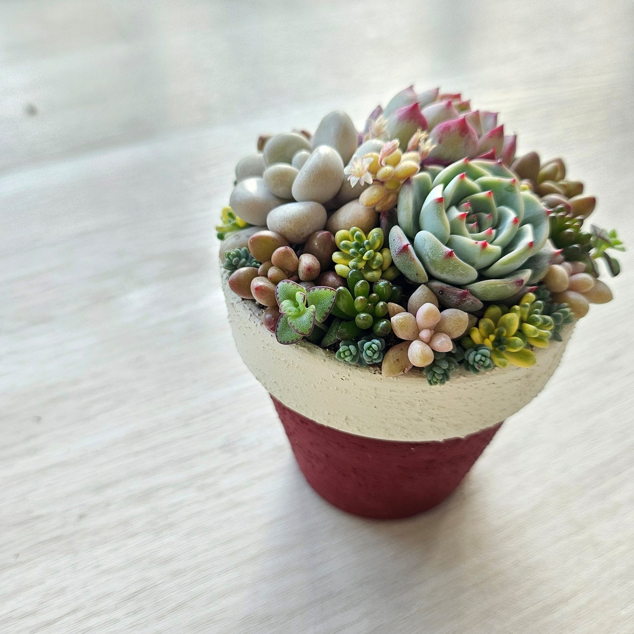 色とりどりの多肉植物をオリジナルリメイク鉢に丁寧に寄せ植えしました。