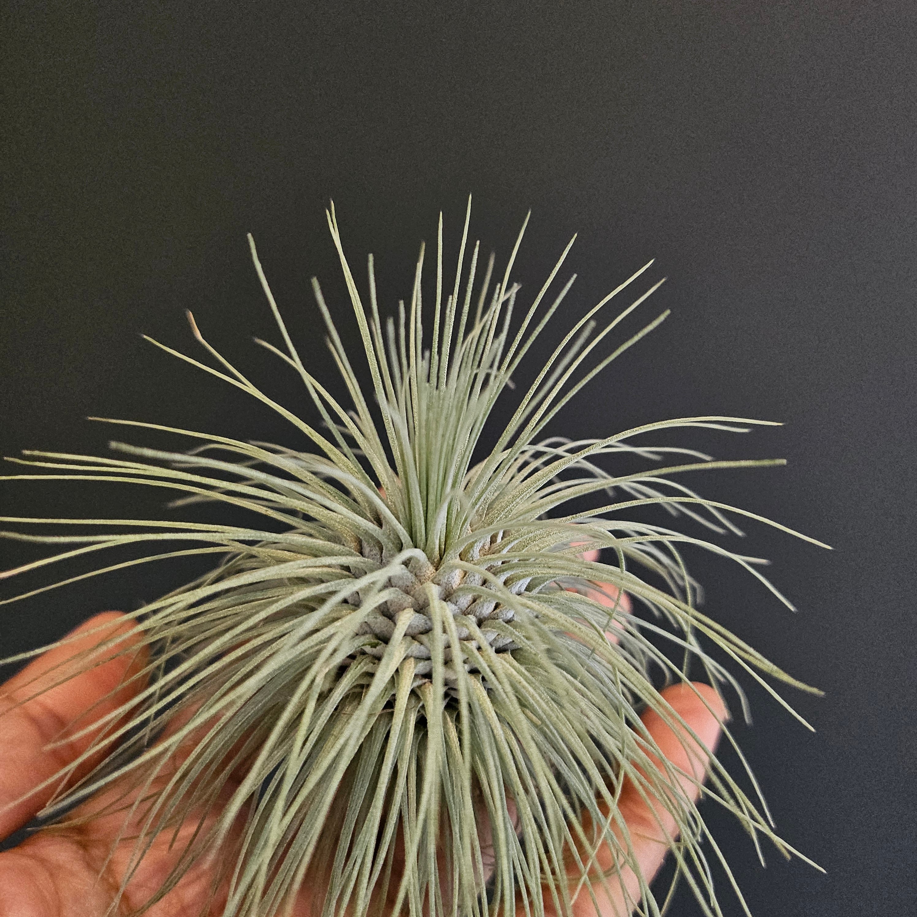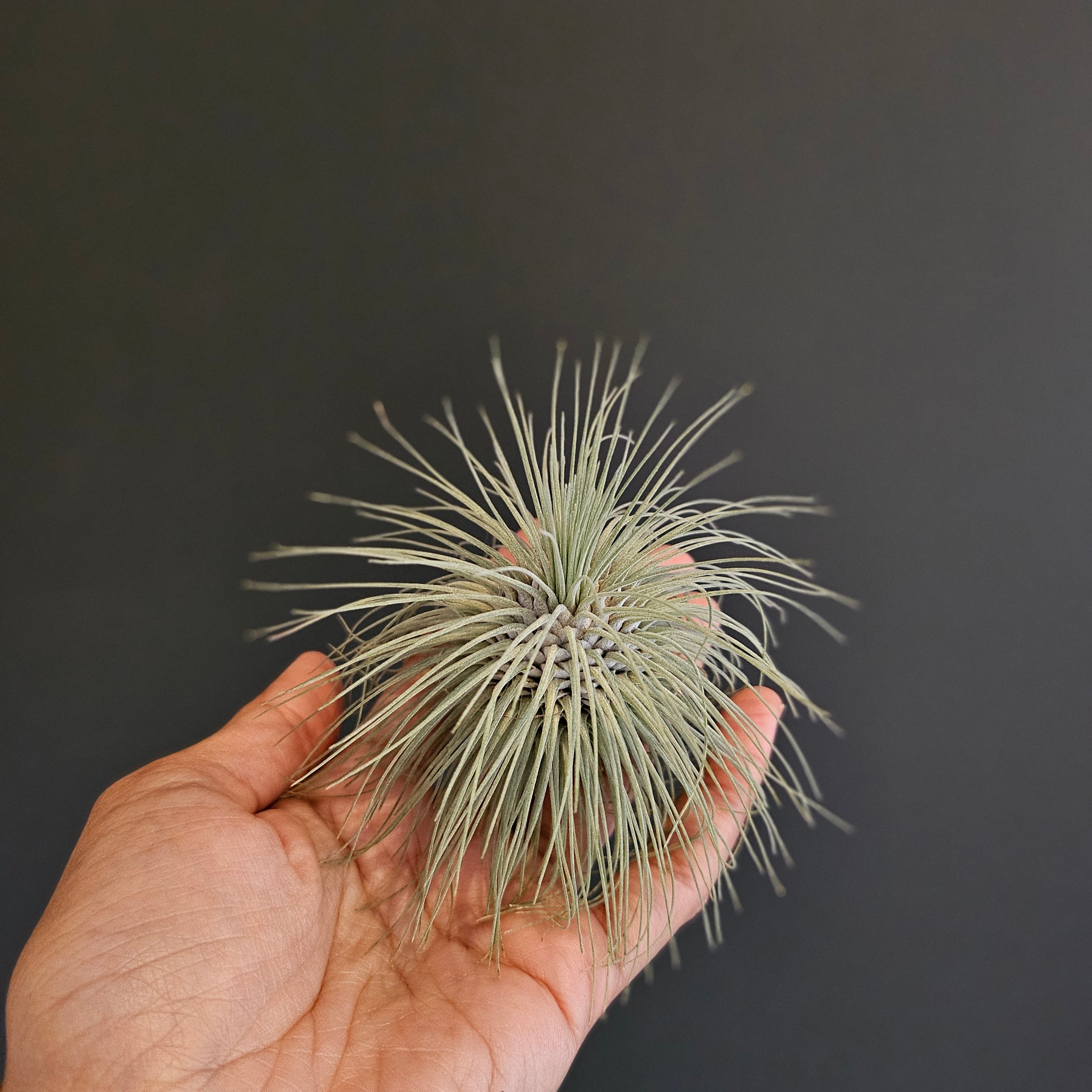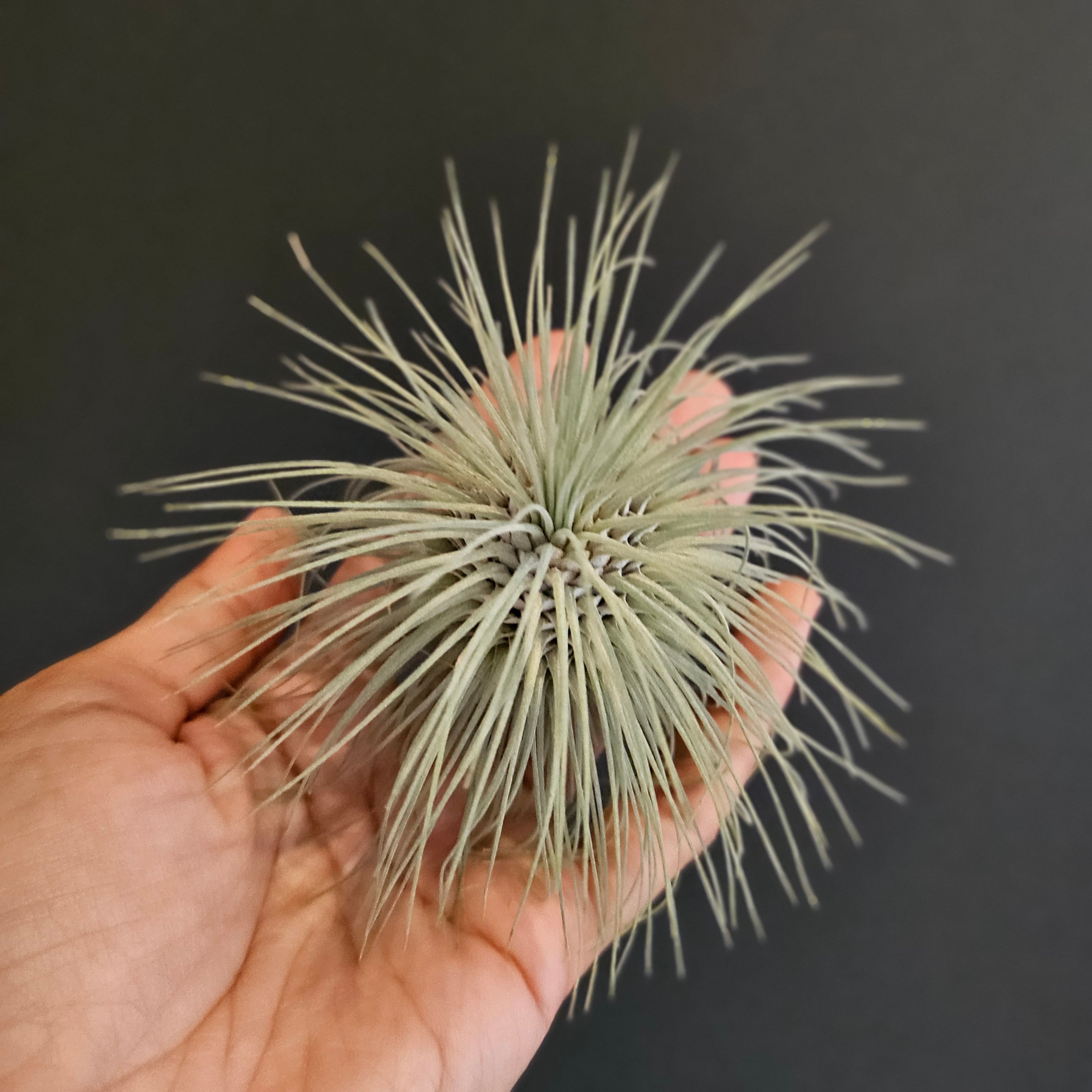 数あるチランジアの中でも、細く繊細な葉が放射状に広がる姿が美しいフックシー・グラシリス。 まるで小さなウニや、繊細な銀細工のようなシルエットが特徴です。葉の表面には「トリコーム」と呼ばれる白い毛が密集しており、光に当たるとキラキラと銀色に輝きます。