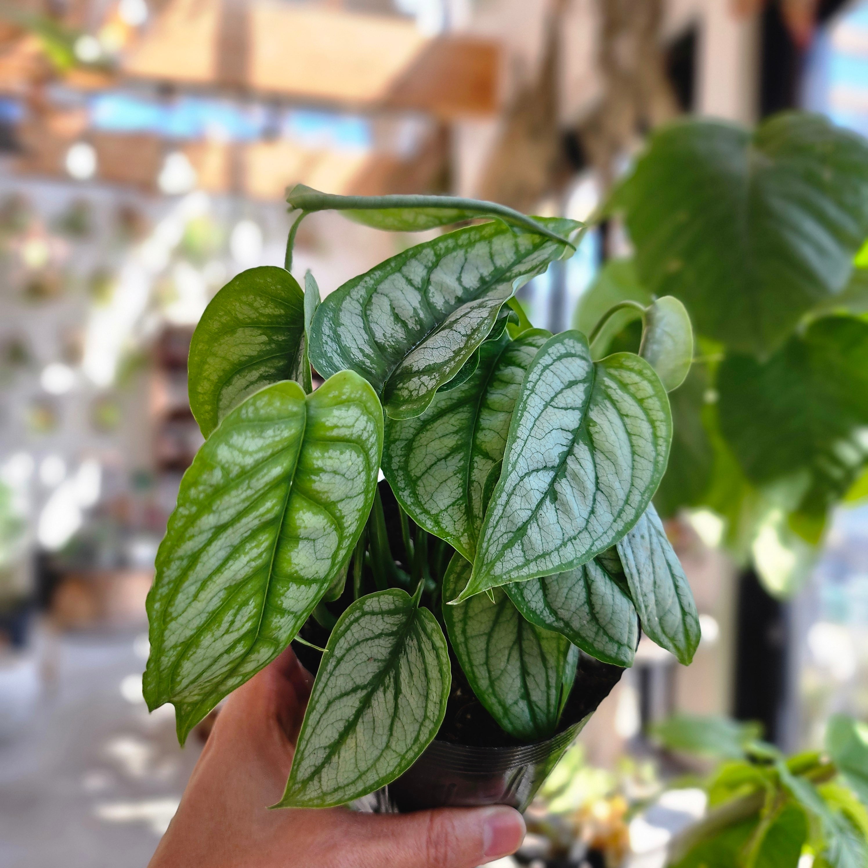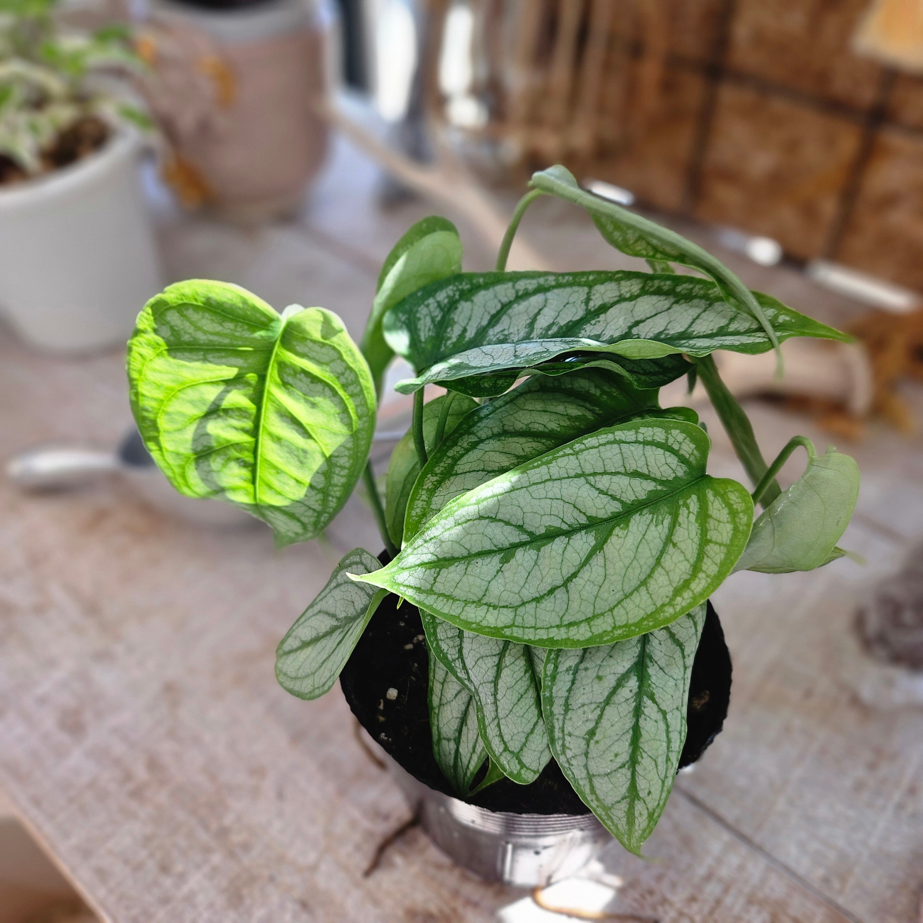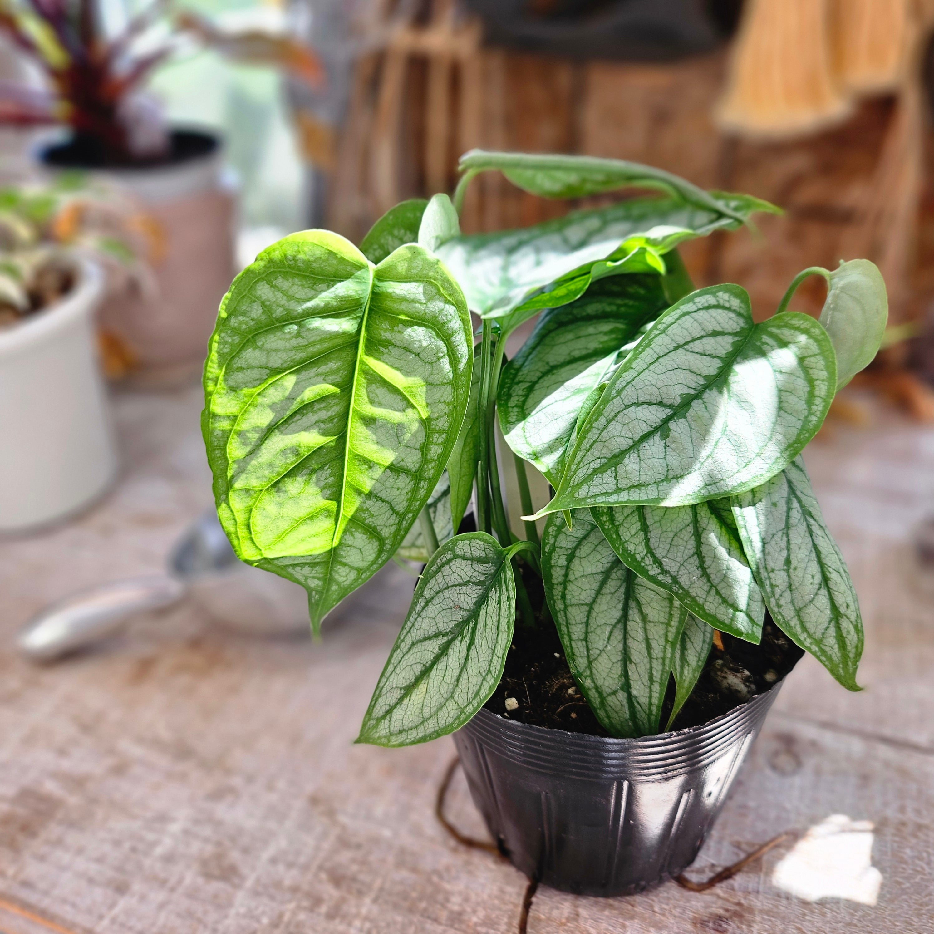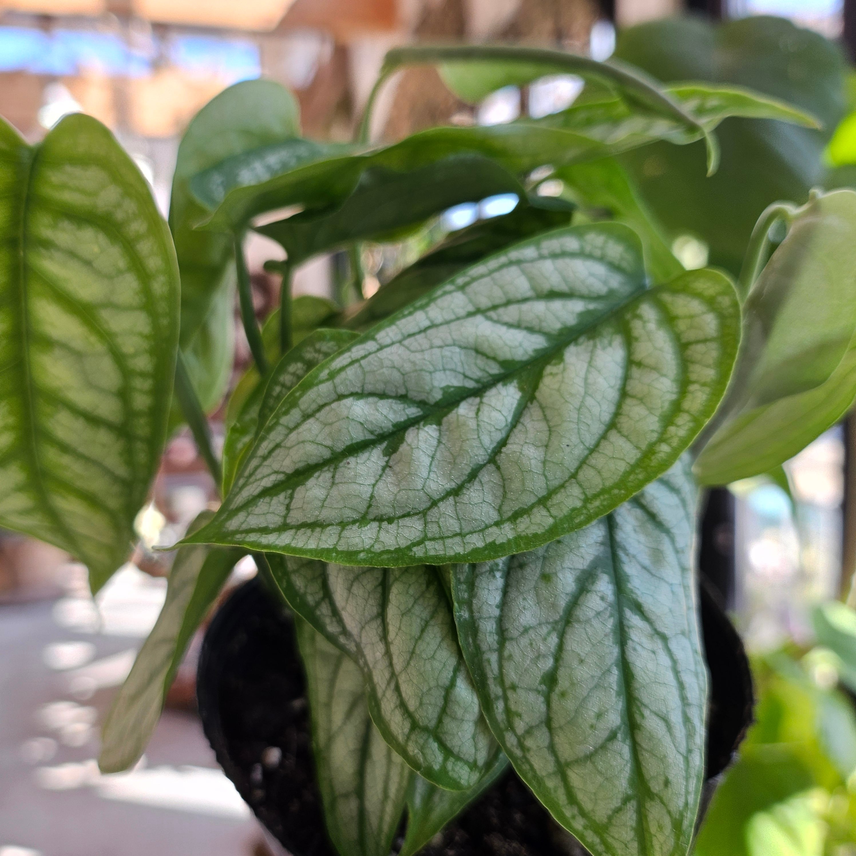 葉全体が美しいシルバーグレーに輝き、濃い緑色の葉脈が網目状に浮き出ています。