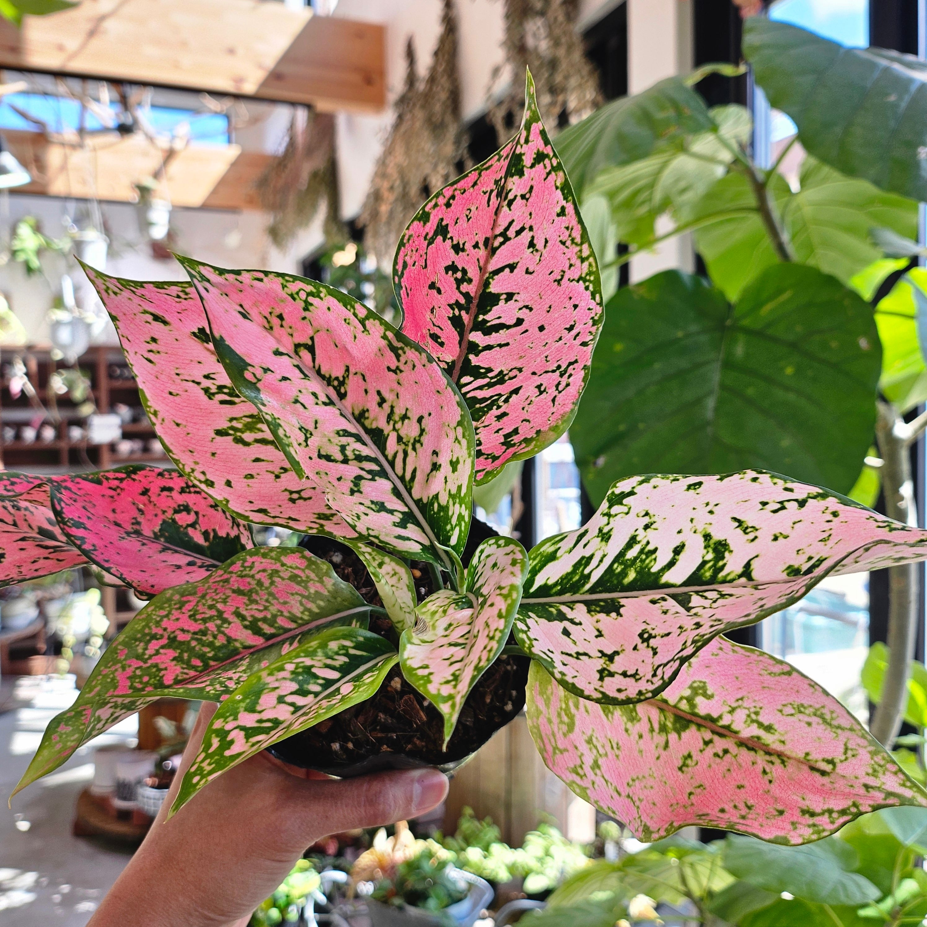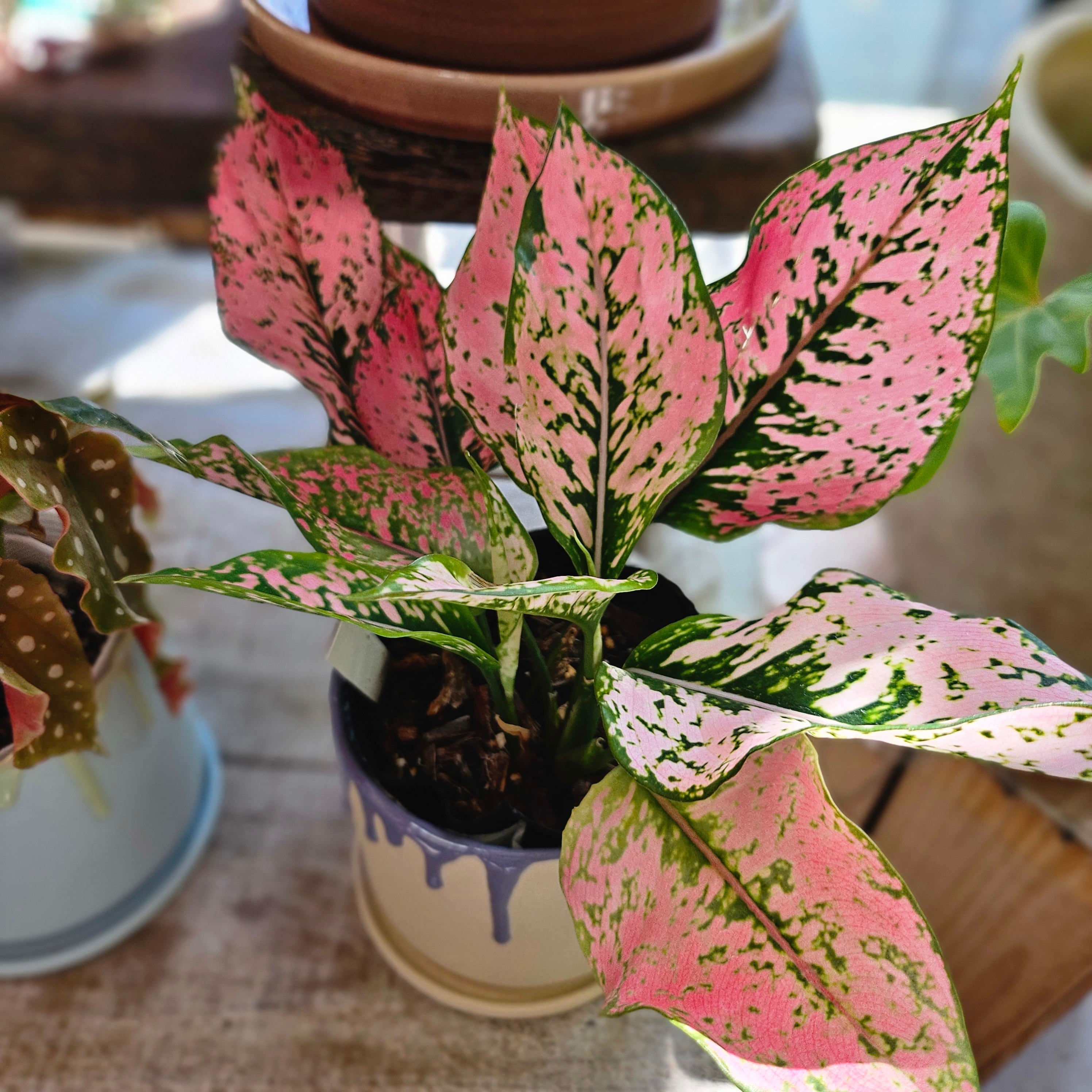 緑の葉に鮮やかなピンクの斑やラインが入り、茎(葉柄)までピンク色に染まる非常に華やかでかわいらしい品種です。