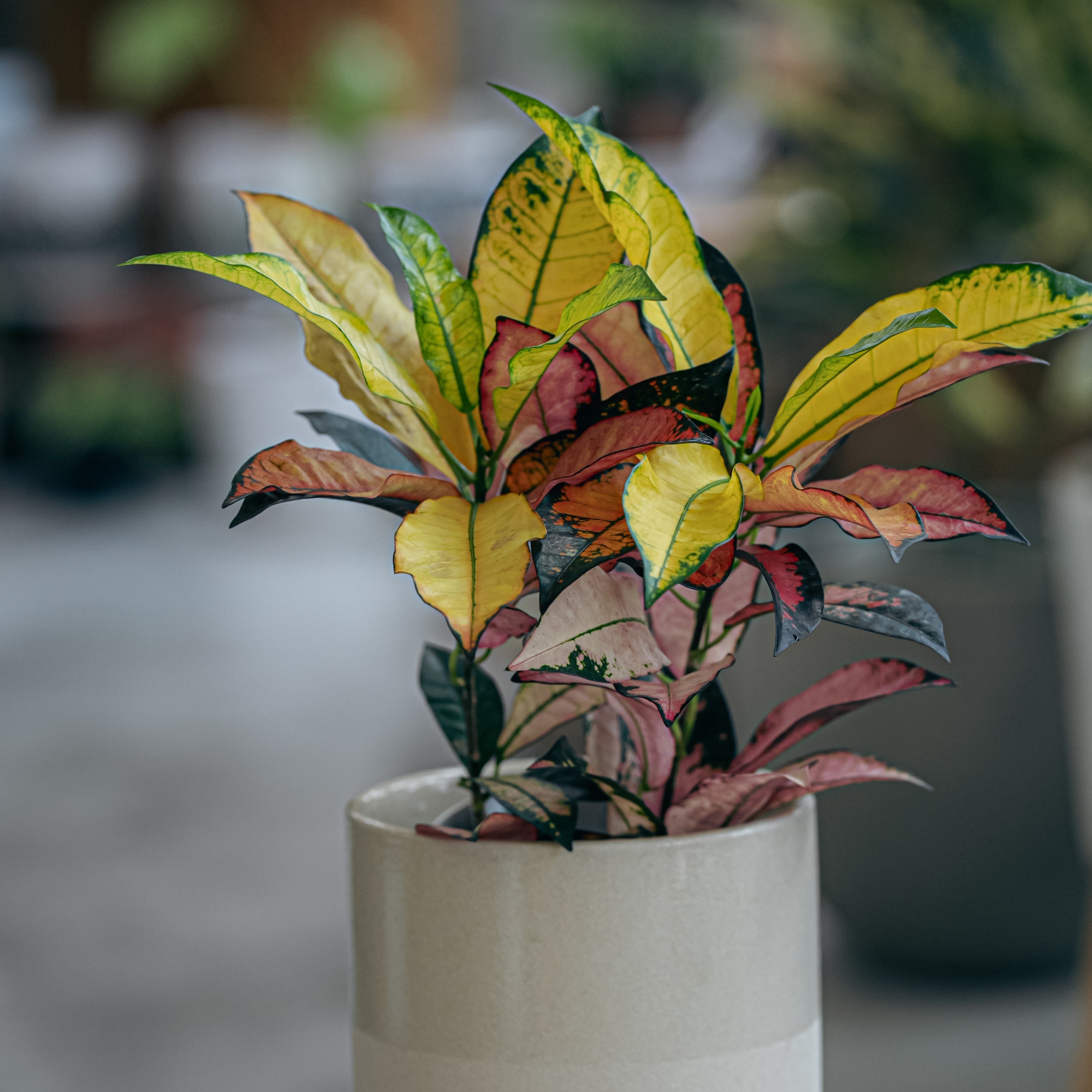 黄色、赤、ピンク、緑色が混ざり合う、非常に鮮やかな葉が特徴です。
